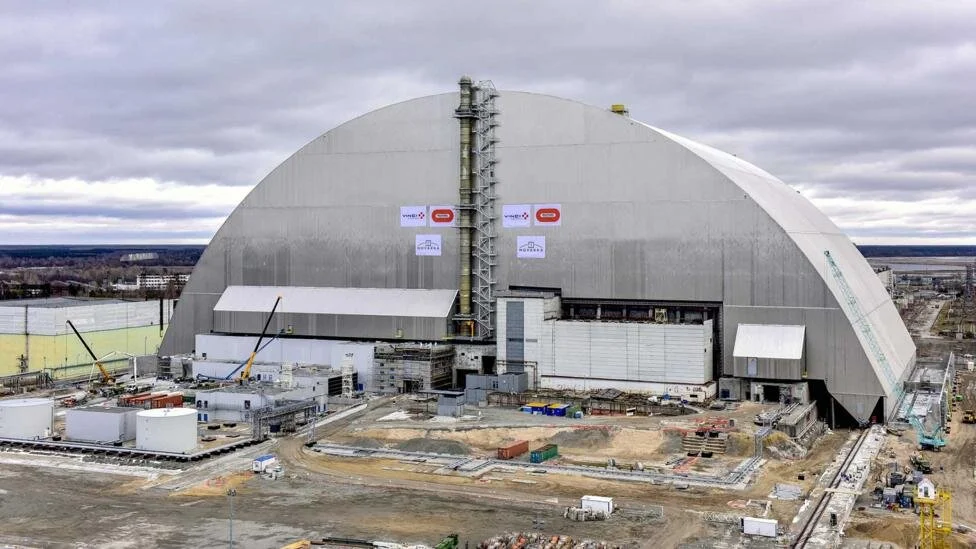 This is the under-construction “New Safe Confinement”. Today - this structure has been moved over the reactor - and will shield it for the next 100 years.